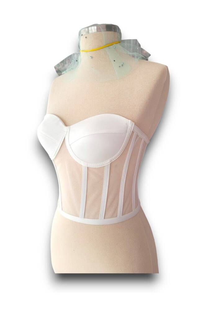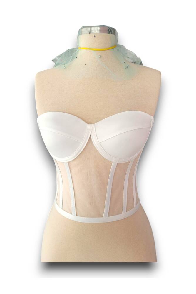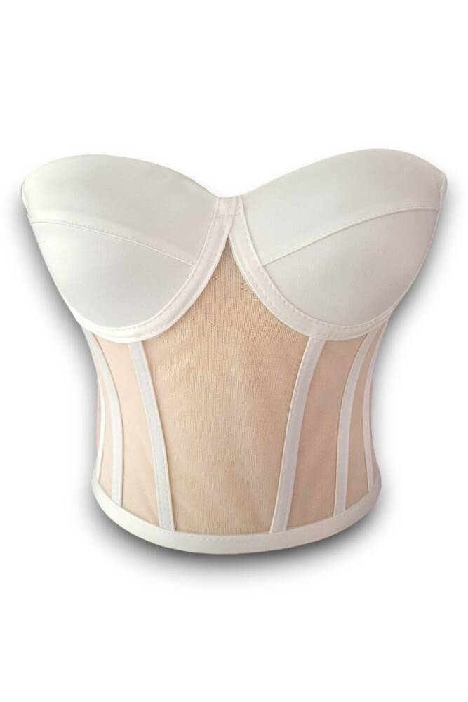 - Zarif tasarımıyla dikkat çeken ekru transparan balenli korse büstiyer, gelinliklerinizde şıklığınızı ön plana çıkarır.; - Saten kumaşı sayesinde pürüzsüz ve yumuşak bir dokunuşa sahip olan bu büstiyer, cildinizle mükemmel uyum sağlar.; - Yetişkinler için ideal olan bu ürün, her yaş grubuna hitap ederek özel günlerde rahatlıkla tercih edilebilir.; - Kısa / mini boyu ile modern ve feminen siluetinizi vurgular; straplez kesimiyle omuzlarınızı zarifçe sergiler.; - Sabit kap yapısı sayesinde konforlu bir kullanım sunarken, bağlama / bağcık detayıyla kişisel tercihinize göre ayarlama imkanı tanır.; - Beyaz rengiyle saf güzelliği yansıtan bu büstiyer, düğün ve nikah gibi özel ortamlarda göz alıcı bir görünüm kazandırır.; - Basic kalıbı ile vücut
