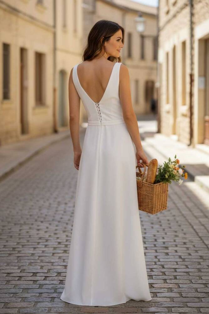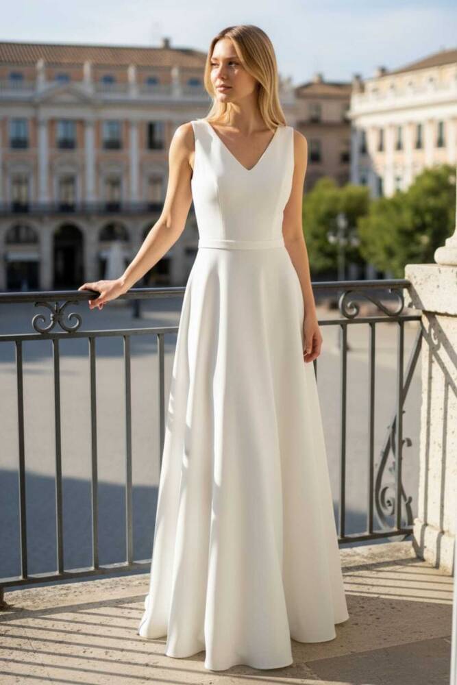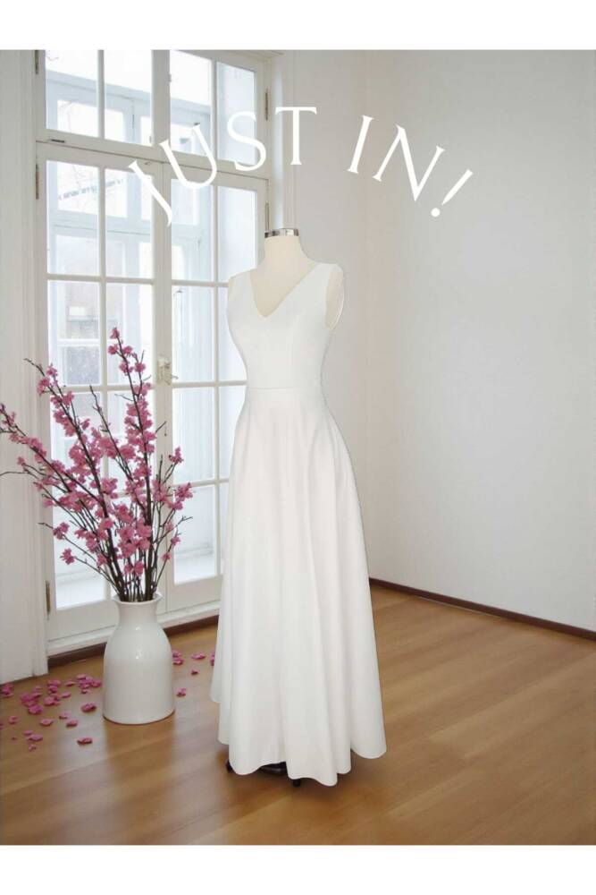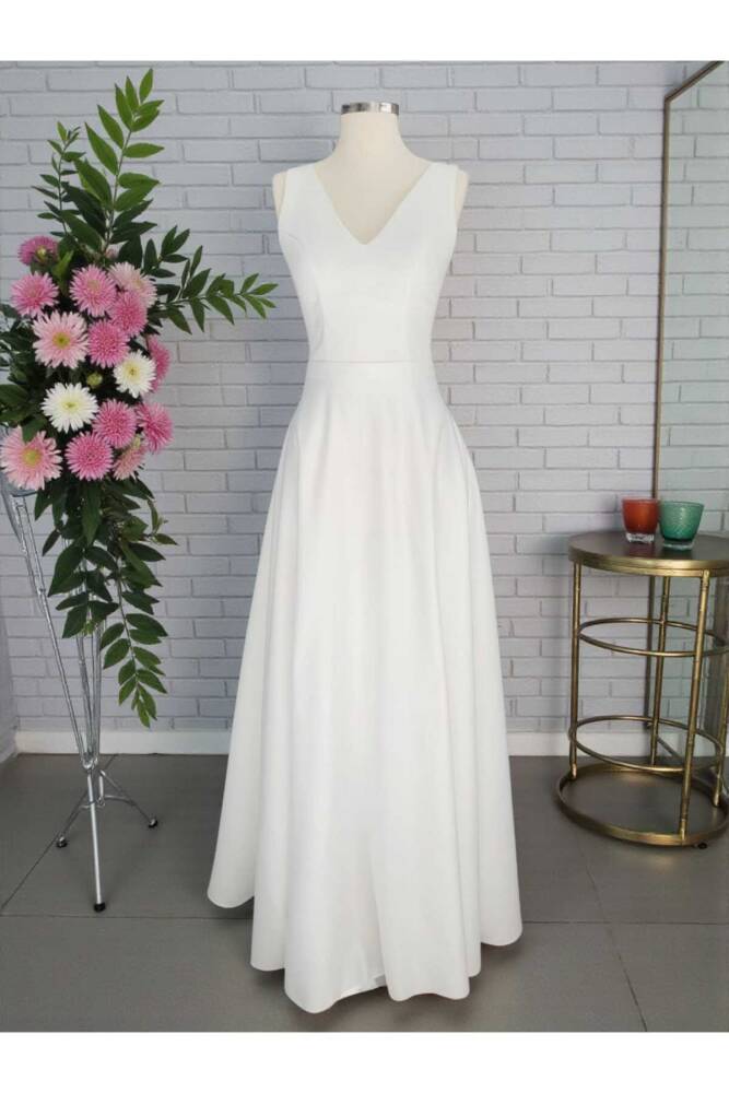 Beyaz V yaka Saten Maxi Boy Hazır Düz Abiye ve Nikah Elbisesi