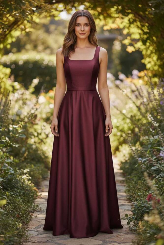 Bordo Kare Yaka Saten Abiye Elbise Maxi Boy