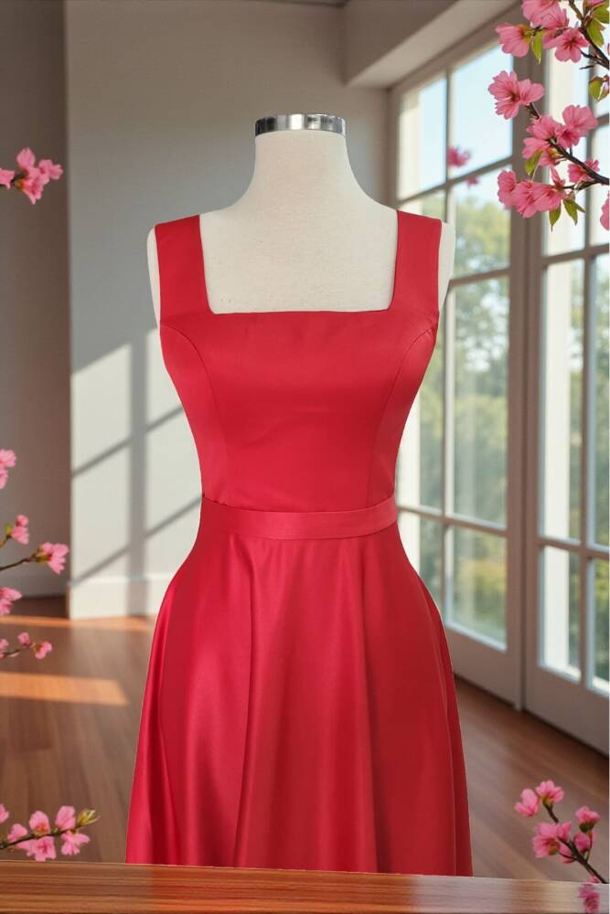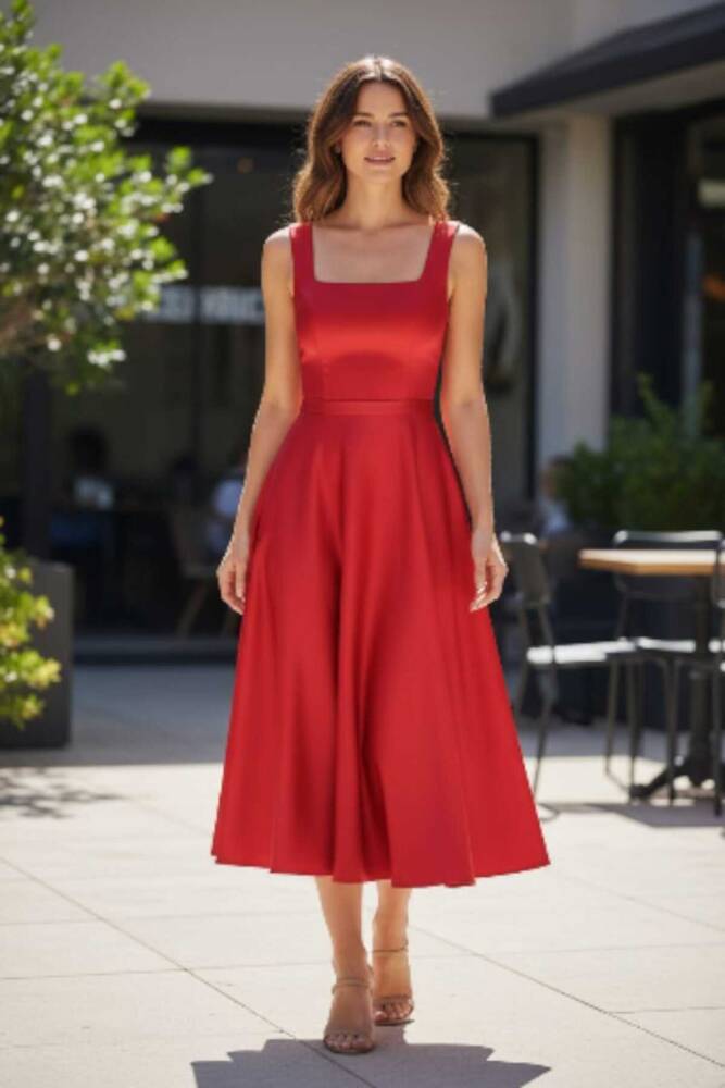 - Kırmızı kare yaka detayı ile zarif bir görünüm sunar.; - Saten kumaşı, şık ve sofistike bir dokunuş katarken, midi boyu modern ve feminen bir siluet oluşturur.; - Kare yaka tasarımı ile boynunuzu zarifçe vurgular ve dekolte bölgesini şık bir şekilde sergiler.; - Kemer veya kuşak detayları ile belinizi zarifçe sararak feminen bir siluet çizer.; - Cep detayları pratik kullanım sağlar ve günlük ihtiyaçlarınızı yanınızda taşımanızı kolaylaştırır.; - Mevsim normlarına uygun olarak tasarlanmıştır, her mevsimde rahatlıkla tercih edilebilir.; - Dokuma tipi, ürünün kalitesini ve dayanıklılığını artırarak uzun süreli kullanım imkanı sunar.; - Astar durumu, elbisenin iç kısmında konforlu bir deneyim sağlamak için düşünülmüştür.; - Ürün tipi olarak a