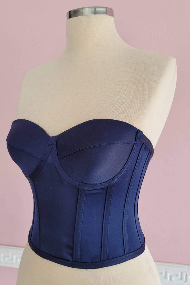 - Zarif saten kumaşı ile dikkat çeken lacivert büstiyer, şıklığınızı ön plana çıkarır.; - Kolsuz tasarımı sayesinde rahat bir kullanım sunar ve straplez yaka detayı ile feminen bir görünüm sağlar.; - Düz deseniyle sade ve zamansız bir stil yaratırken, crop boy kesimiyle modern ve şık bir siluet oluşturur.; - Balen detayı sayesinde göğüs bölgesini toparlayarak daha dolgun bir görünüm kazandırır.; - Bağcıklı kapama şekliyle pratik kullanım imkanı sunarken, dikme kap yapısıyla konforlu bir deneyim sağlar.; - Her yaş grubuna hitap eden tasarımıyla geniş bir kullanıcı kitlesine uygunluk gösterir.