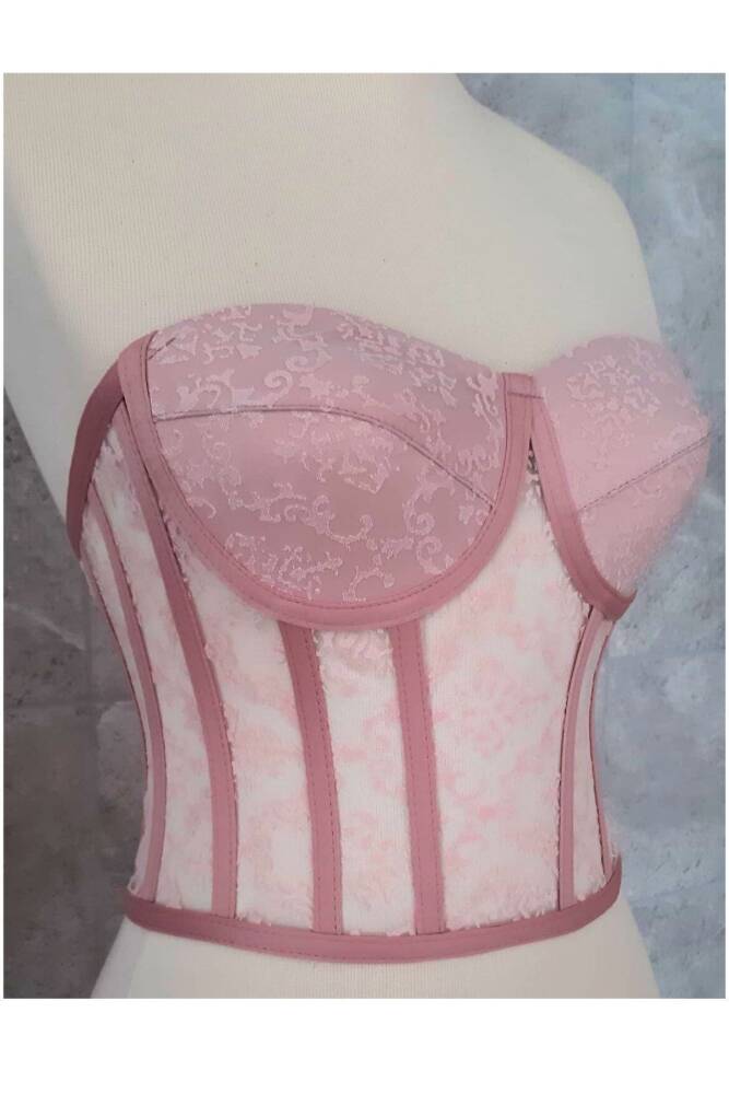 Zarif pudra rengiyle dikkat çeken bu transparan büstiyer, şık ve göz alıcı bir görünüm sunar.; Straplez yaka tasarımı ile omuzları açıkta bırakırken, omzu açık silueti feminen hatlarınızı vurgular.; Toparlayıcı özelliği sayesinde daha sıkı ve formda bir görünüm sağlar, vücut hatlarınızı mükemmel şekilde sarar.; Bağcıklı kapama şekliyle kolayca ayarlanabilir ve kişisel konforunuzu artırır.; Pudra rengindeki düz deseniyle sade ama etkileyici bir stil oluşturmanızı sağlar.; Dokuma kumaş tipi, dayanıklılığı artırarak uzun süreli kullanım imkanı sunarken saten materyali pürüzsüz bir dokunuş hissi verir.; Gece şıklığınıza uyum sağlayacak tasarımıyla tüm gözlerin üzerinizde olmasını sağlar.; Tüm yaş gruplarına hitap eden hazır beden seçeneğiyle he