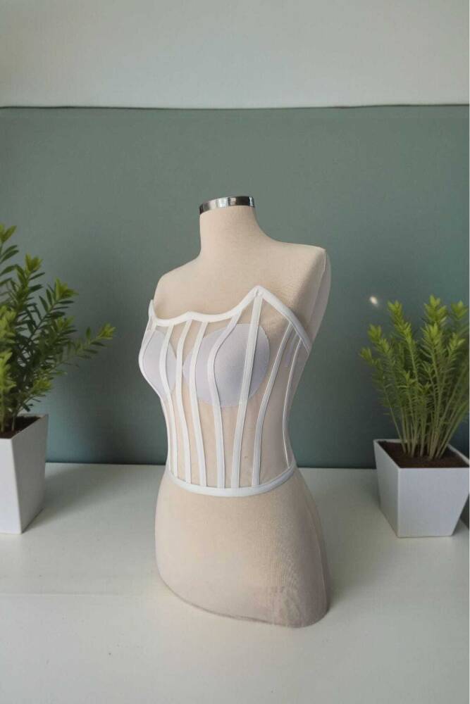 - Balenli tasarımı sayesinde vücut hatlarını belirginleştirir ve destek sağlar.; - Transparan yapısı ile şeffaf bir görünüm sunar, gelinlik altında zarif bir dokunuş yaratır.; - Hazır beden seçeneğiyle kolayca uyum sağlar ve pratik bir kullanım sunar.; - Beyaz rengi ile klasik ve zamansız bir görünüm elde edilir.;